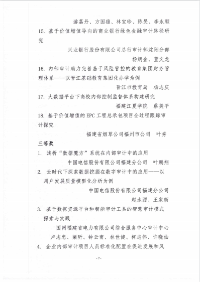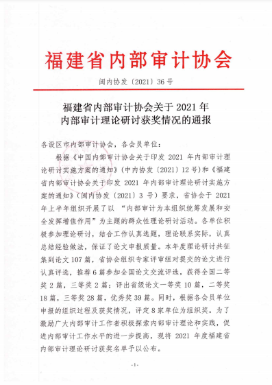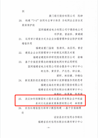 日前,福建省內部審計協會通報內部審計促進組織貫徹落實黨和國家重大政策措施典型經驗名單,以及2021年度內部審計理論研討獲獎情況,由泉州文旅集團提交的《泉州文旅集團促進組織貫徹落實黨和國家重大政策措施的經驗材料》被列入全省典型經驗材料,獲得“福建省2021年內部審計促進組織貫徹落實黨和國家重大政策措施典型經驗”稱號;由泉州文旅集團審計部撰寫的《淺議如何保障國有小股東在混合所有制企業中權益》榮獲全省內部審計理論研討三等獎。